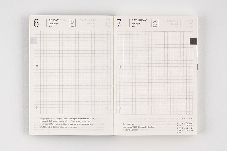 | 記載される内容 | 日番号/週番号(月間カレンダーと1日ページに記載)/月の満ち欠け(1日ページ全ページに記載・月間カレンダーに満月と新月のみ記載) |