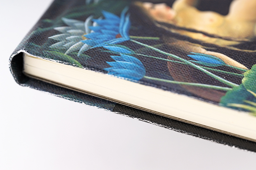 表紙に使用している素材は、レーヨンをベースにした素材です。通常の紙より凹凸があり、独自の風合いがあるのが特徴です。そのため、端や背の部分に割れがおこり、特に濃い色の場合だと目立つ場合があります。予め素材特性としてご了承ください。