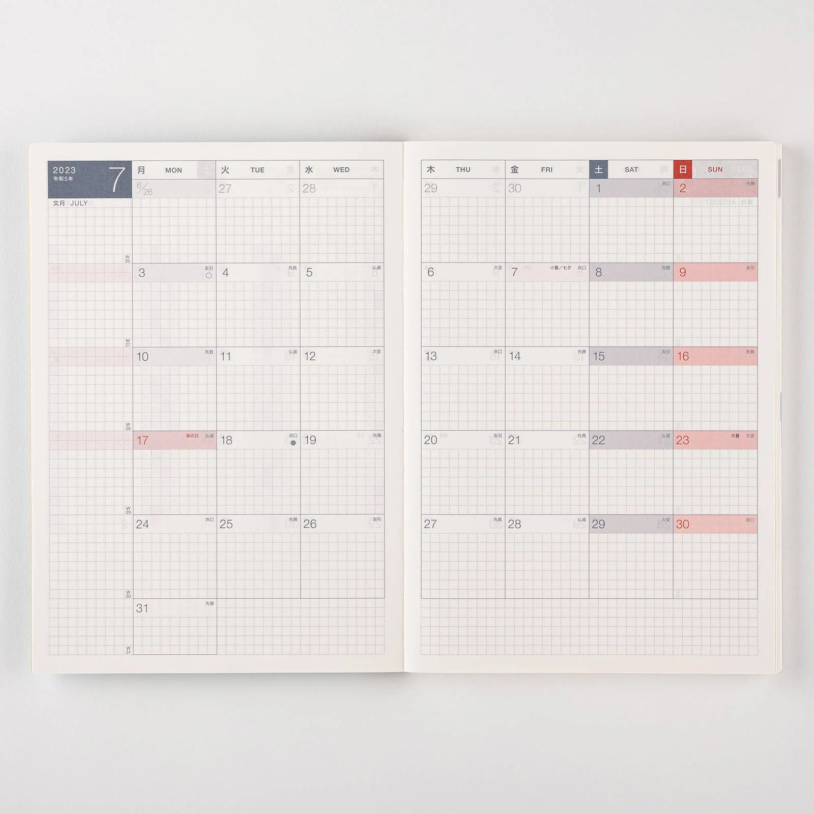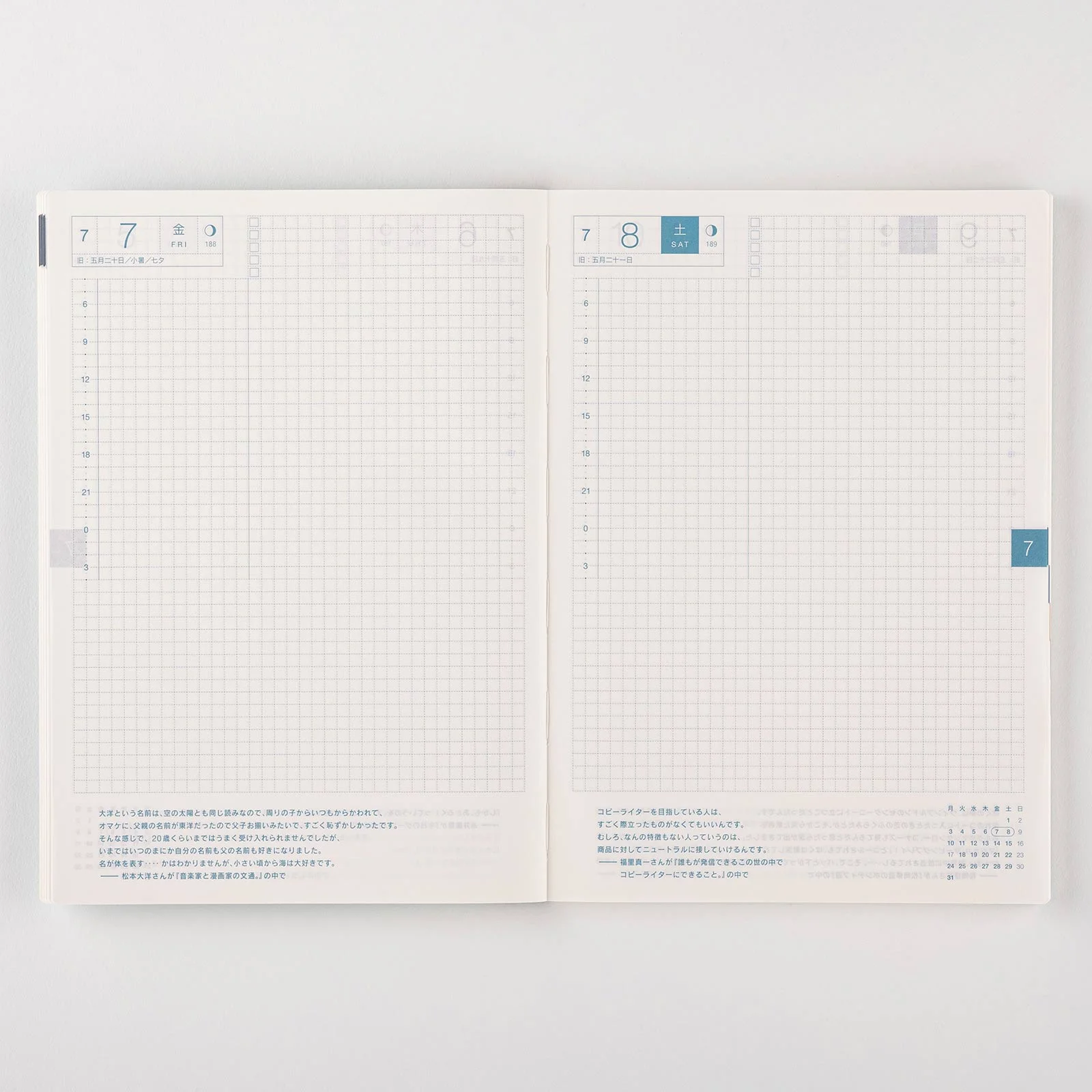 | 記載される内容 | 日番号/週番号(月間カレンダー・週間ダイアリーに記載)/旧暦/六曜(大安、仏滅など)(月間カレンダーに記載)/二十四節気(立春、春分、夏至など)、雑節/祝日、記念日など(バレンタインデー、ひなまつり、母の日、父の日など)/月の満ち欠け(1日ページ全ページに記載、月間カレンダー・週間ダイアリーに満月と新月のみ記載) |