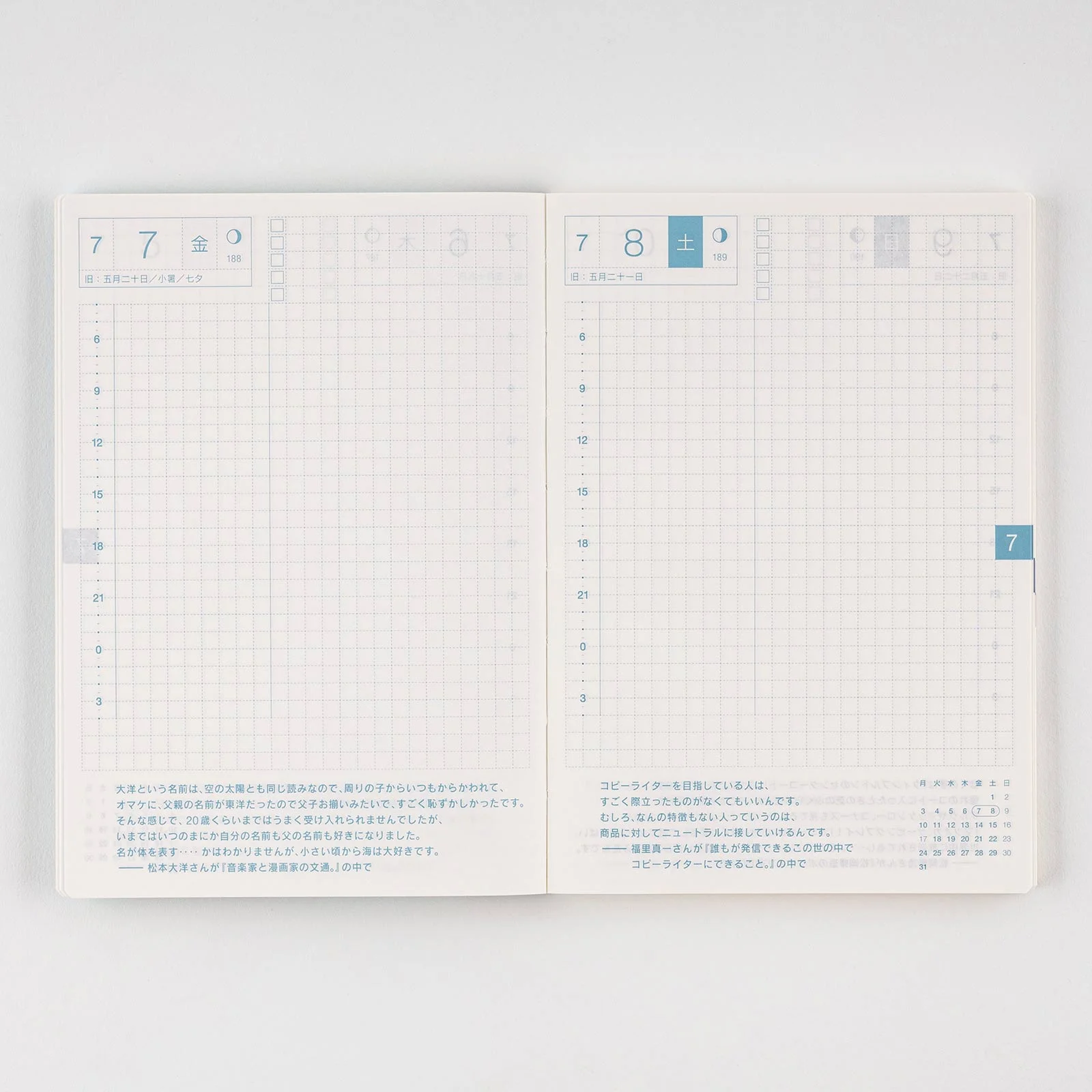 | 記載される内容 | 日番号/週番号(月間カレンダーに記載)/旧暦/六曜(大安、仏滅など)(月間カレンダーに記載)/二十四節気(立春、春分、夏至など)、雑節/祝日、記念日など(バレンタインデー、ひなまつり、母の日、父の日など)/月の満ち欠け(1日ページ全ページに記載、月間カレンダーに満月と新月のみ記載) |