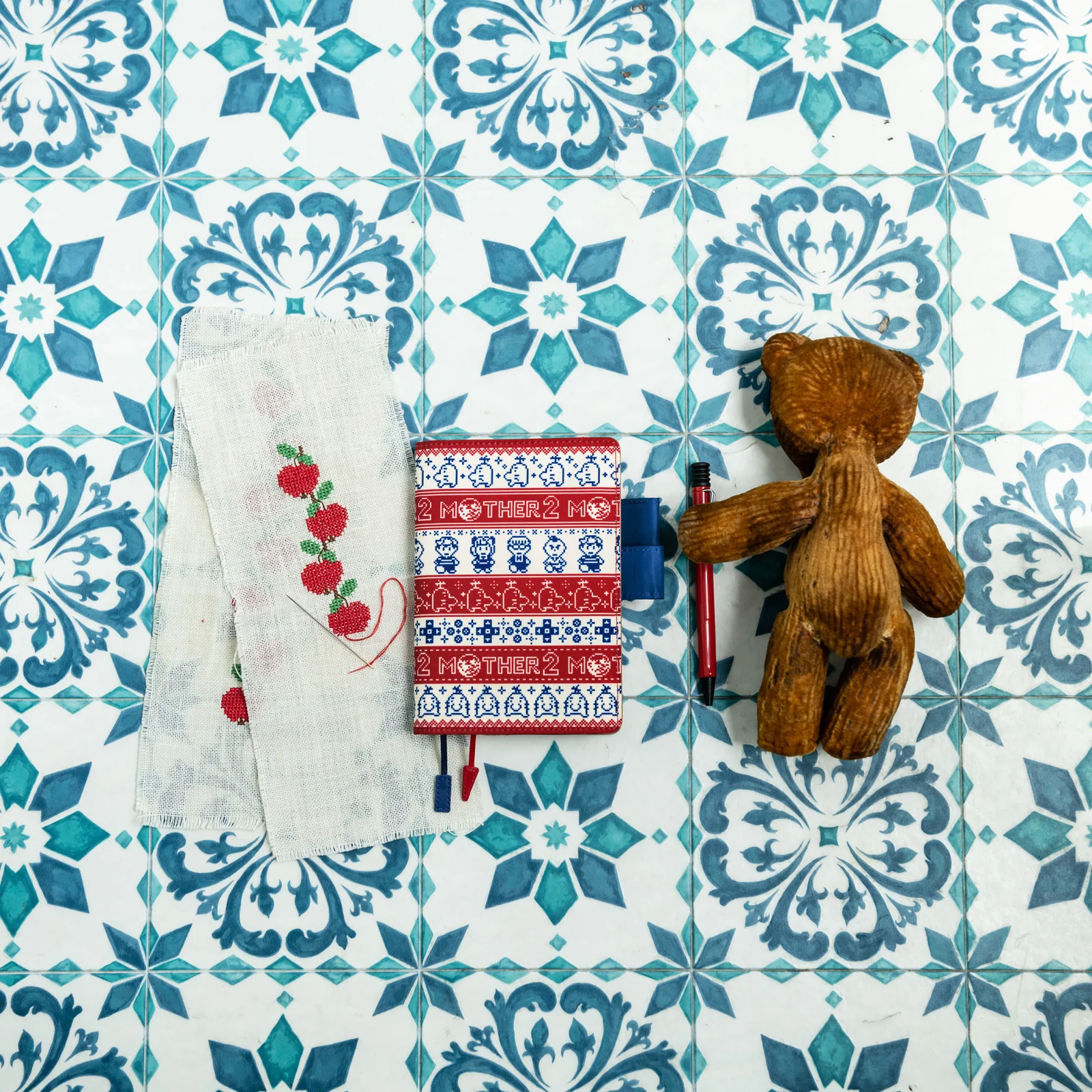 表のピクセルパターンとおそろいの青と赤。