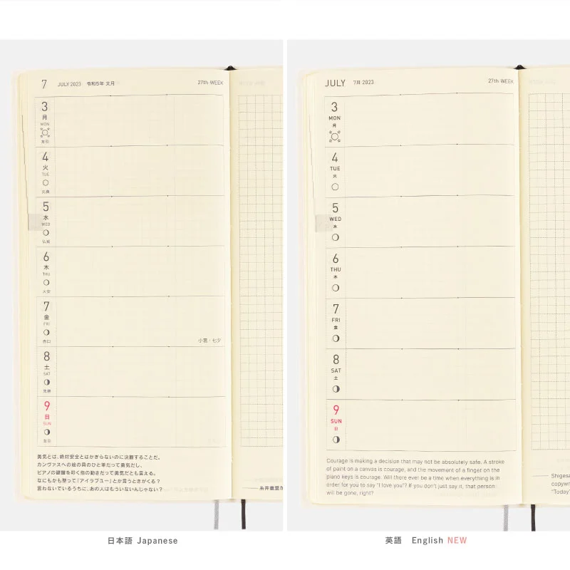 | 記載される内容 | 週番号/月の満ち欠け(週間ページ全てに記載・月間カレンダーに満月と新月のみ記載) ※祝日の記載はありません。 |
