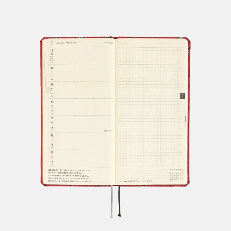 | 記載される内容 | 週番号/六曜(大安、仏滅など)/二十四節気(立春、春分、夏至など)/祝日、記念日など(バレンタインデー、ひなまつり、母の日、父の日など)/月の満ち欠け(週間ページ全てに記載・月間カレンダーに満月と新月のみ記載) |