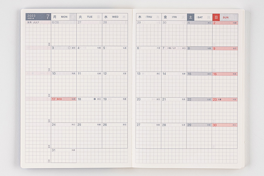 | 紙質・製本 | 薄くて軽く、裏抜けの少ないトモエリバー(手帳専用紙)/糸かがり製本 |