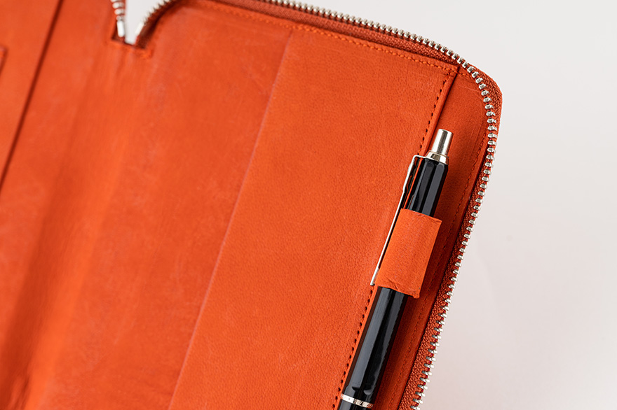 本体と同じ革を使用したシンプルなデザイン。