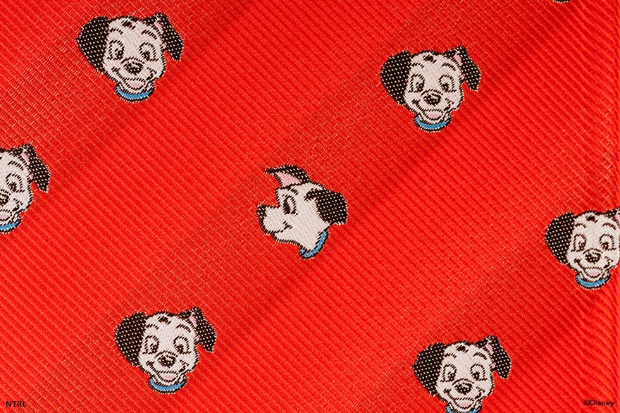 ウォームレッドの生地に子犬の顔が並ぶ、