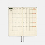 | 記載される内容 | 週番号/月の満ち欠け(週間ページ全てに記載・月間カレンダーに満月と新月のみ記載) ※祝日の記載はありません。 |