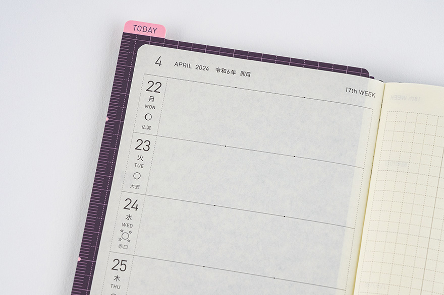 | 記載される内容 | 週番号/六曜(大安、仏滅など)/二十四節気(立春、春分、夏至など)/祝日、記念日など(バレンタインデー、ひなまつり、母の日、父の日など)/月の満ち欠け(週間ページ全てに記載・月間カレンダーに満月と新月のみ記載) |