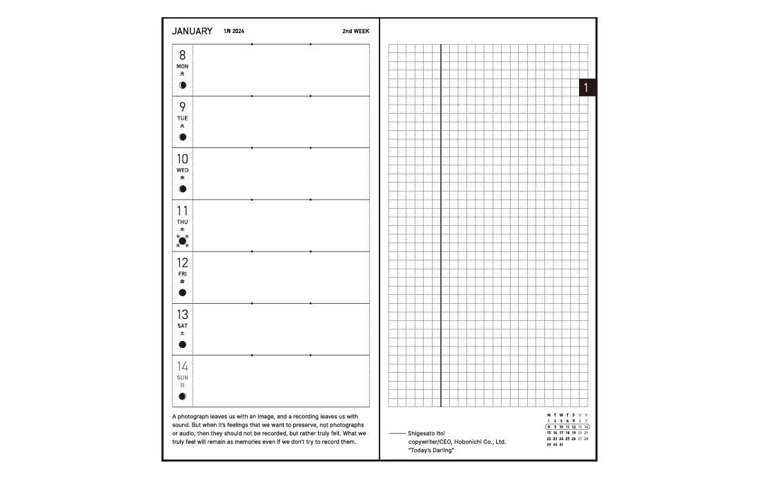 | 記載される内容 | 週番号/月の満ち欠け(週間ページ全てに記載・月間カレンダーに満月と新月のみ記載) ※祝日の記載はありません。 |