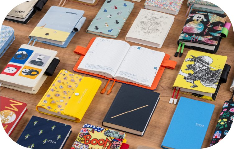 「ほぼ日手帳」「ひきだしポーチ」のほか、手帳と相性のよいさまざまな文具や雑貨を販売しています。企業やアーティストとつくっている「別注版」(OEM) の情報は、専用ページをごらんください。