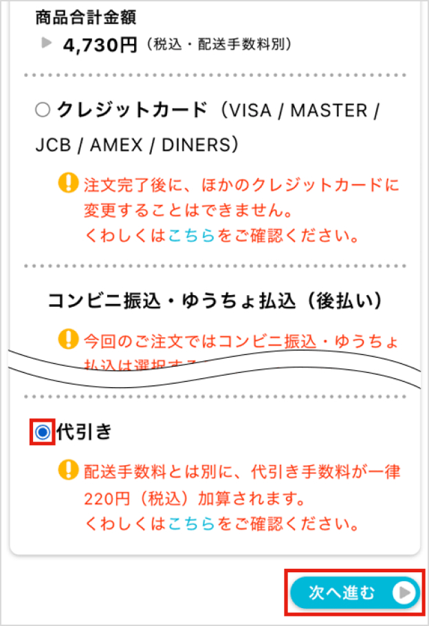 代引き手数料を一律220円(税込)申し受けます。お支払いは現金のみです。