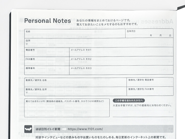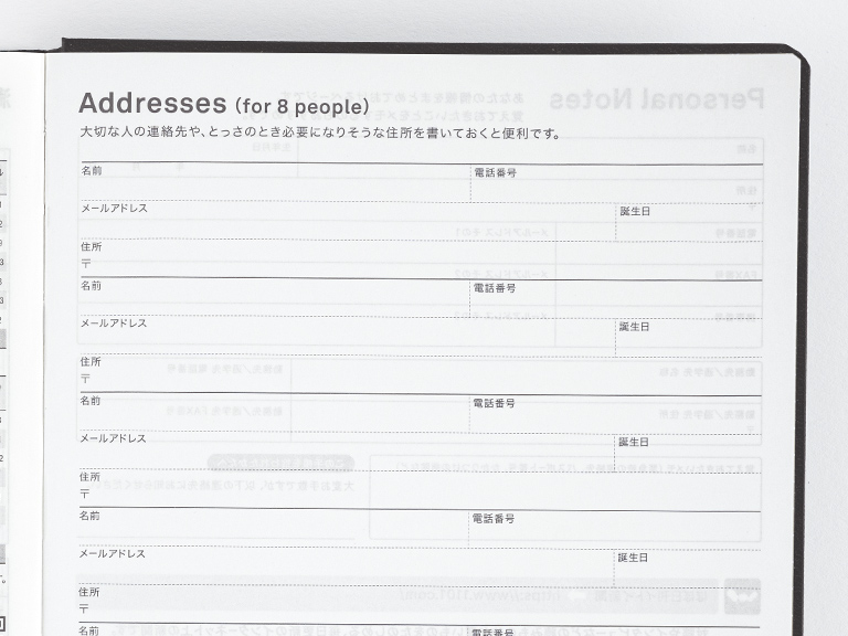 家族や友人の連絡先などを書いておけるアドレス帳です。