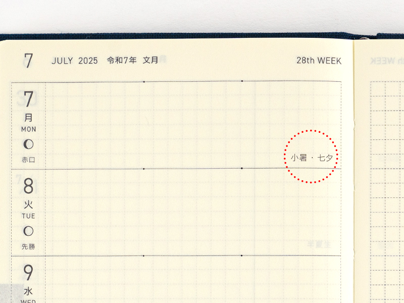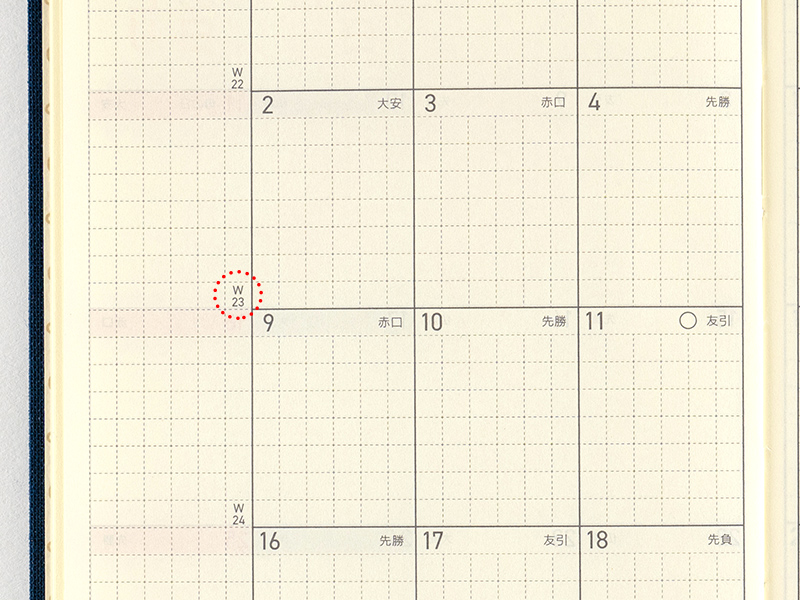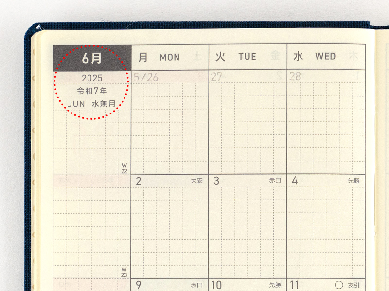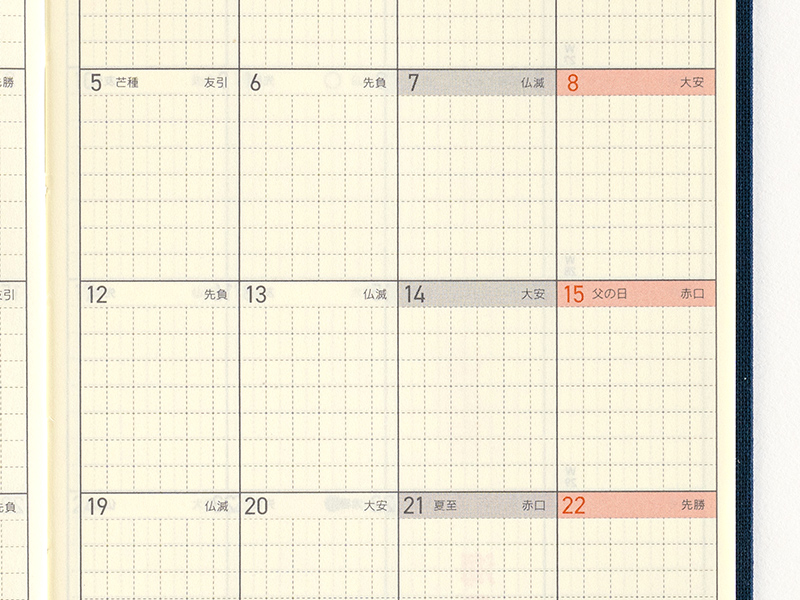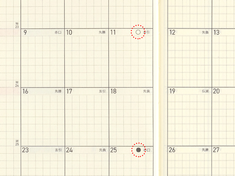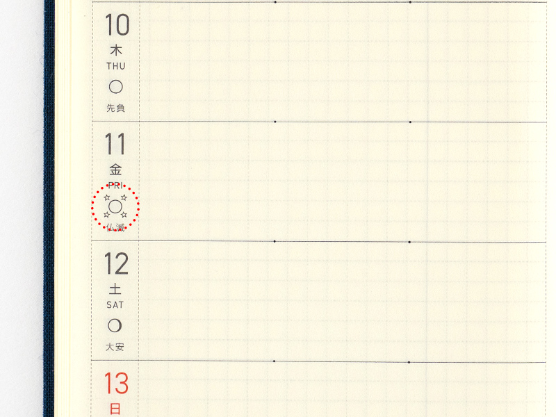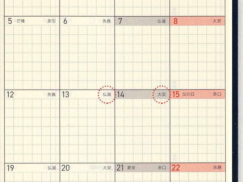「大安」や「仏滅」といった「六曜」も記載しています。