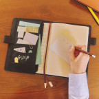 カバーの使いはじめは、ペンホルダー、またはバタフライストッパーの生地や革がかたいため、ペンが抜きさししづらくなっています。