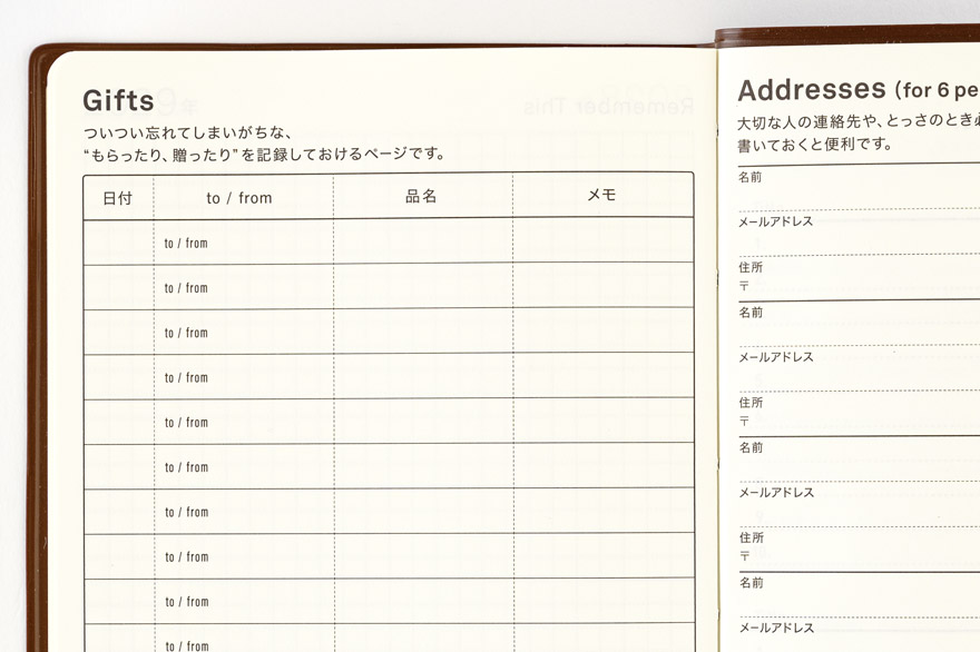 | おまけページ | 1年1ページメモ/Remember This/Gifts/Addresses(for 6 people)/My Lists/わたしの好きなもの/Personal Notes |