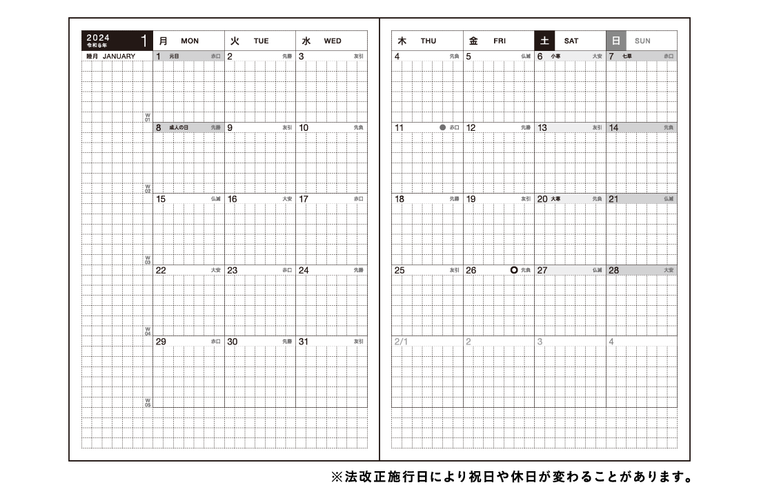 | 記載される内容 | 日番号/週番号(月間カレンダーに記載)/旧暦/六曜(大安、仏滅など)(月間カレンダーに記載)/二十四節気(立春、春分、夏至など)、雑節/祝日、記念日など(バレンタインデー、ひなまつり、母の日、父の日など)/月の満ち欠け(月間カレンダーに満月と新月のみ記載) |