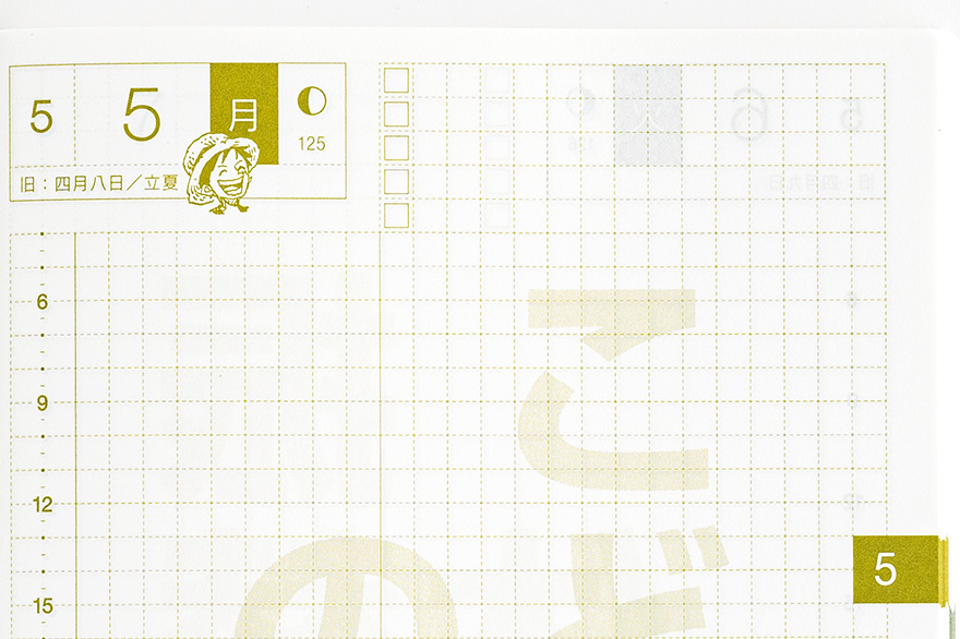 | 記載される内容 | 日番号/週番号(月間カレンダーに記載)/旧暦/六曜(大安、仏滅など)(月間カレンダーに記載)/二十四節気(立春、春分、夏至など)、雑節/祝日、記念日など(バレンタインデー、ひなまつり、母の日、父の日など)/月の満ち欠け(1日ページ全ページに記載、月間カレンダーに満月と新月のみ記載) |