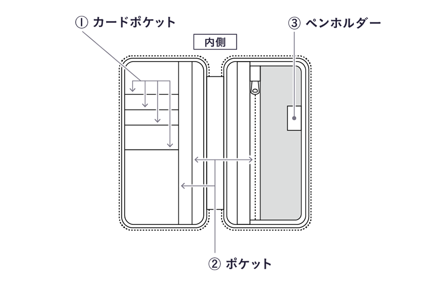 手帳といっしょに文房具や書類、カードなどを持ち運べるように設計されていますが、容量を超える収納はお避けください。