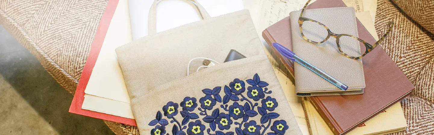 パソコンや雑誌がらくらく入るマチ付きトートバッグ。