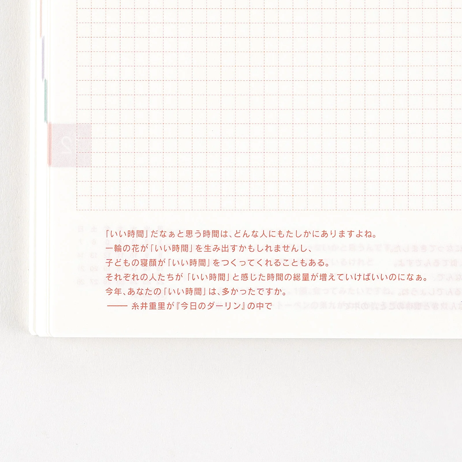 | おまけページ | Time Table/Graph Paper/Favorites/My 100/まねして描けるスケジュールアイコン/書くのがたのしみになる日記/47都道府県のおすすめ麺リスト/二十四節気のこと/もしものときの、準備をしよう/Gifts/満年齢早見表/単位換算表/「ほぼ日」を、もっとたのしむ。/Addresses (for 8 people)/Personal Notes |