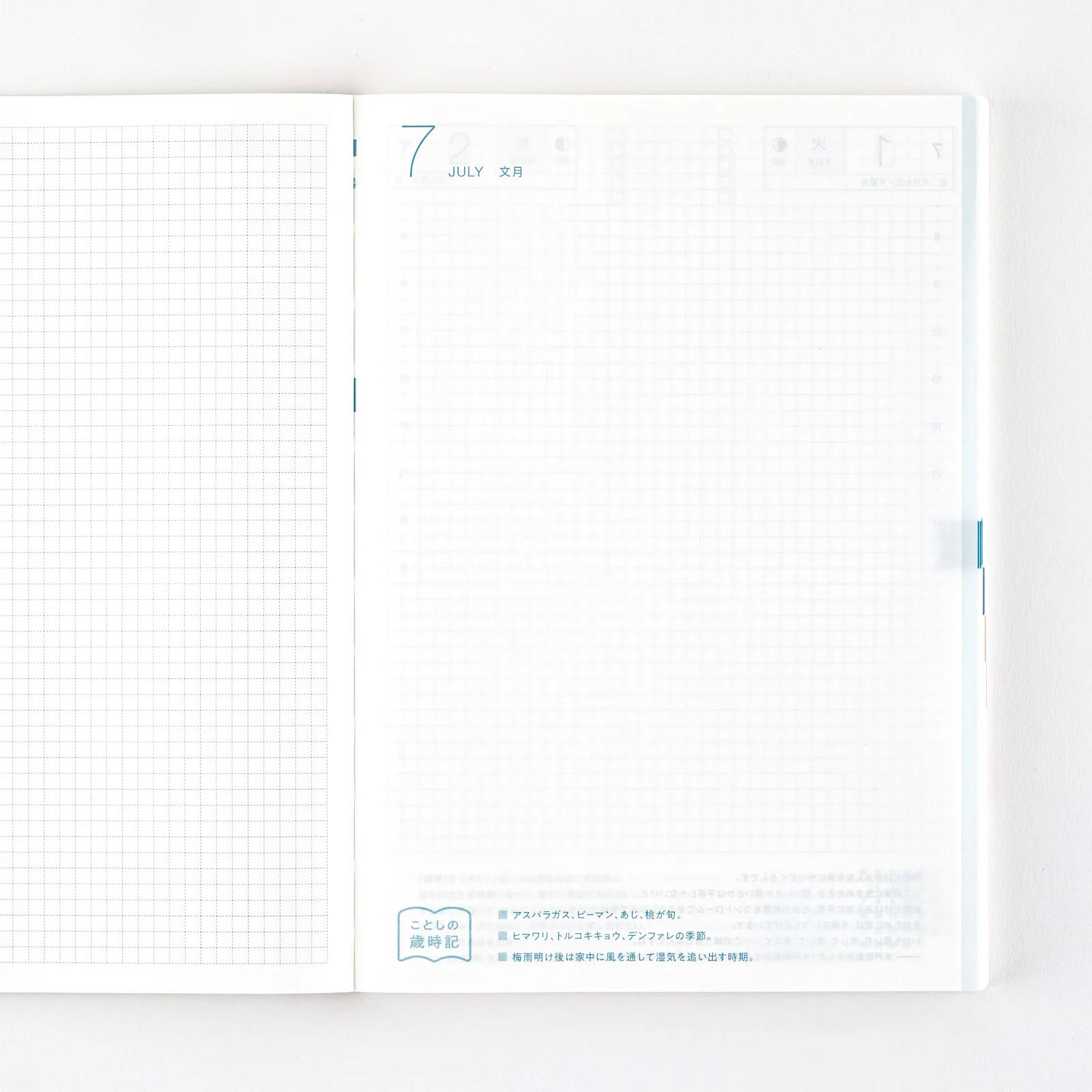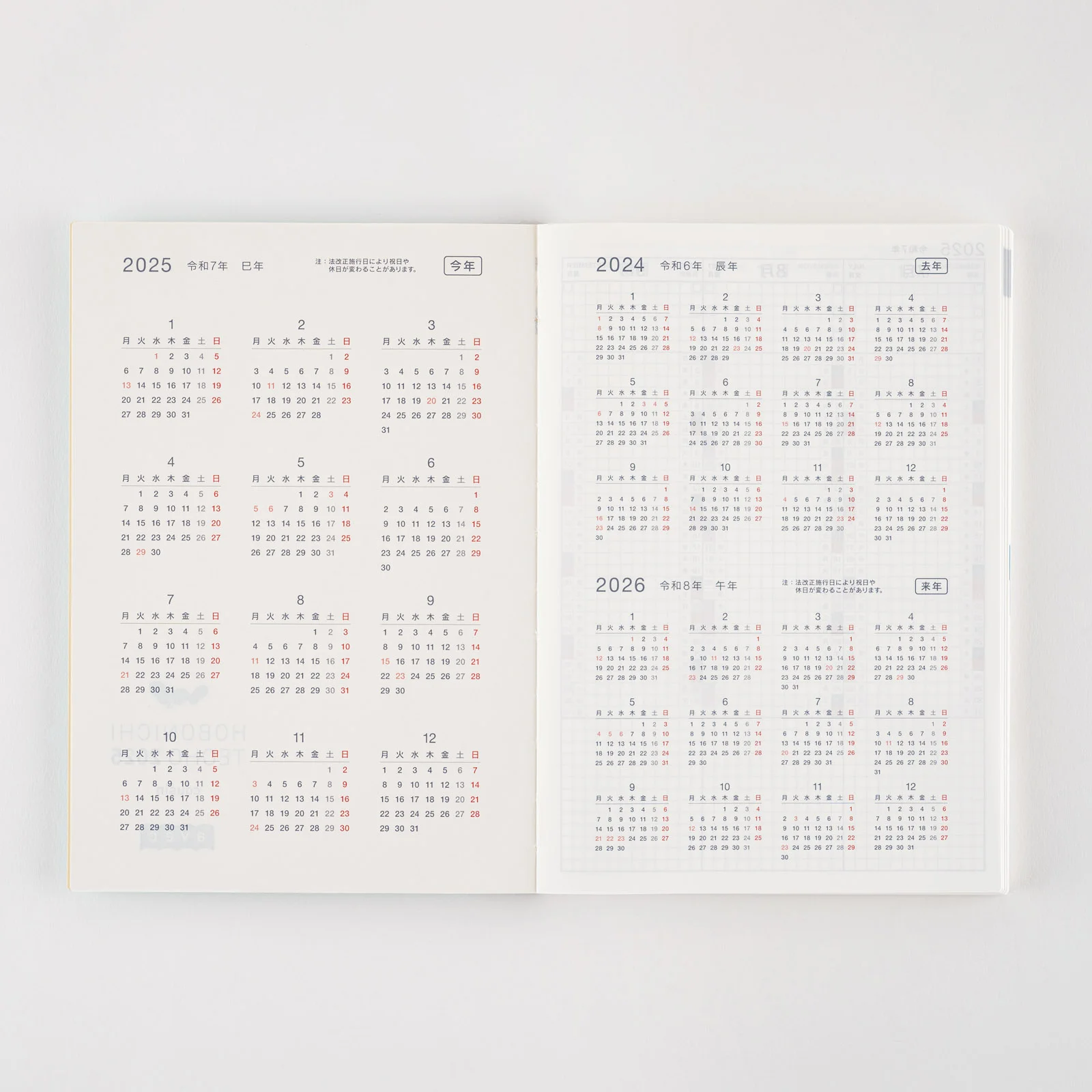 | 記載される内容 | 日番号/週番号(月間カレンダー・週間ダイアリーに記載)/旧暦/六曜(大安、仏滅など)(月間カレンダーに記載)/二十四節気(立春、春分、夏至など)、雑節/祝日、記念日など(バレンタインデー、ひなまつり、母の日、父の日など)/月の満ち欠け(1日ページ全ページに記載、月間カレンダー・週間ダイアリーに満月と新月のみ記載) |
