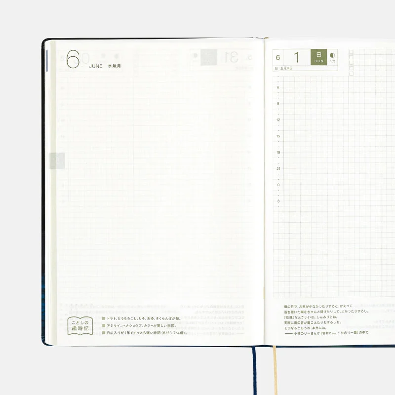 | 記載される内容 | 日番号/週番号(月間カレンダー・週間ダイアリーに記載)/旧暦/六曜(大安、仏滅など)(月間カレンダーに記載)/二十四節気(立春、春分、夏至など)、雑節/祝日、記念日など(バレンタインデー、ひなまつり、母の日、父の日など)/月の満ち欠け(1日ページ全ページに記載、月間カレンダー・週間ダイアリーに満月と新月のみ記載) |