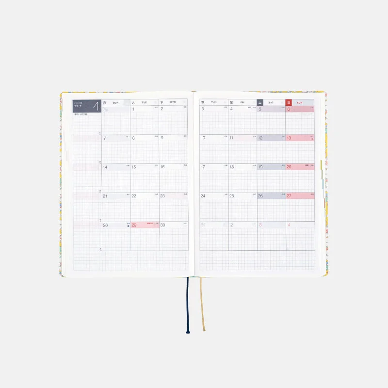 | 一日ページ | 2025年1月1日〜12月31日(全377ページ) *手帳の使いはじめに、自由に使えるウォーミングアップ用ページ(2ページ)があります。 *各月のはじめに、その月のことをまとめて書ける扉ページ(1ページ)があります。 *すべてのページに「日々の言葉」を掲載(見開きに1つ)。 *右ページに「ミニカレンダー」を掲載(月曜はじまり)。 |
