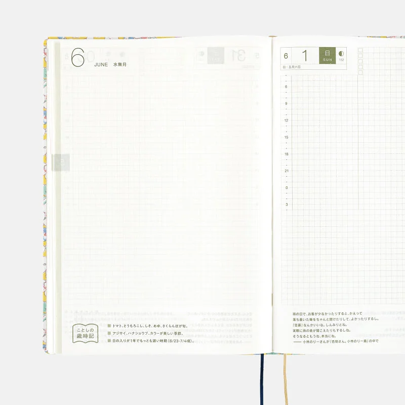 | 記載される内容 | 日番号/週番号(月間カレンダー・週間ダイアリーに記載)/旧暦/六曜(大安、仏滅など)(月間カレンダーに記載)/二十四節気(立春、春分、夏至など)、雑節/祝日、記念日など(バレンタインデー、ひなまつり、母の日、父の日など)/月の満ち欠け(1日ページ全ページに記載、月間カレンダー・週間ダイアリーに満月と新月のみ記載) |