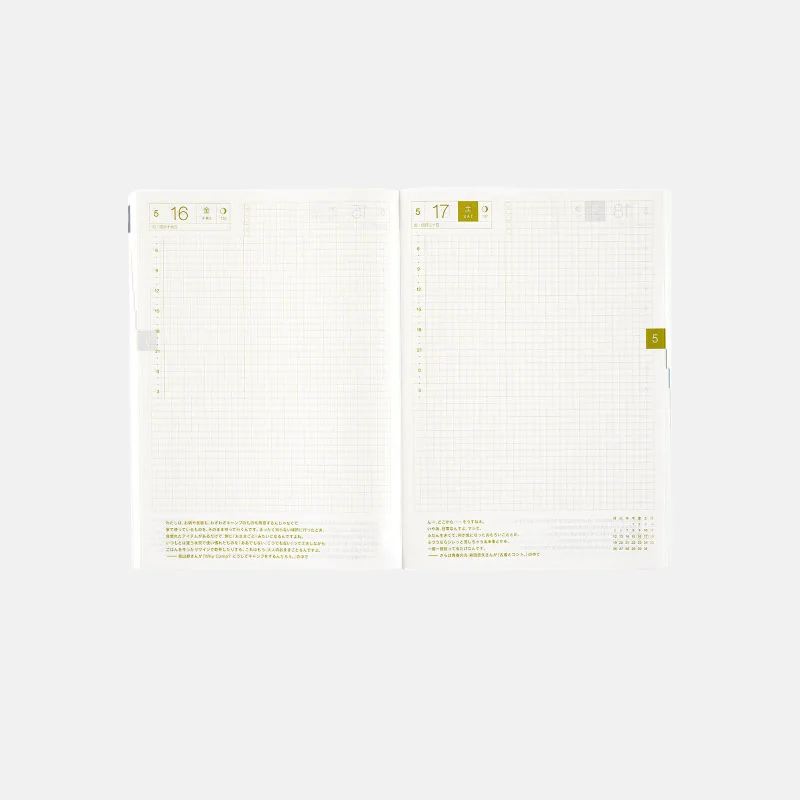 | 記載される内容 | 日番号/週番号(月間カレンダー・週間ダイアリーに記載)/月の満ち欠け(1日ページ全ページに記載、月間カレンダー・週間ダイアリーに満月と新月のみ記載) |