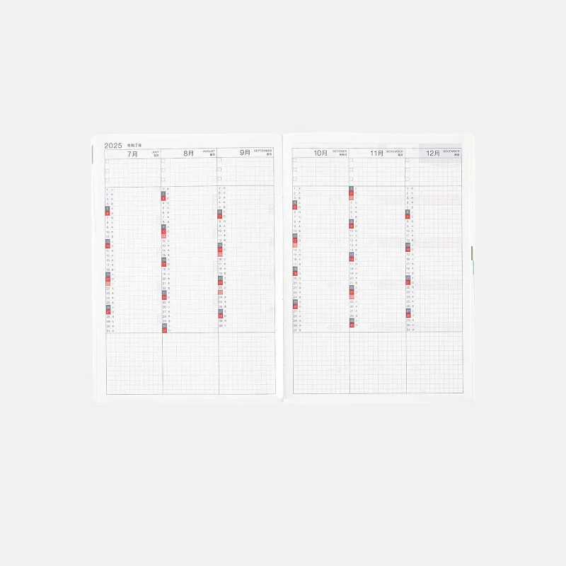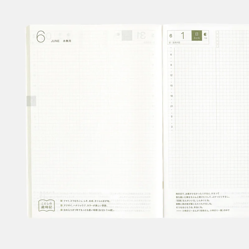 | 記載される内容 | 日番号/週番号(月間カレンダー・週間ダイアリーに記載)/旧暦/六曜(大安、仏滅など)(月間カレンダーに記載)/二十四節気(立春、春分、夏至など)、雑節/祝日、記念日など(バレンタインデー、ひなまつり、母の日、父の日など)/月の満ち欠け(1日ページ全ページに記載、月間カレンダー・週間ダイアリーに満月と新月のみ記載) |