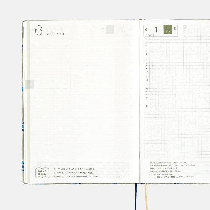 | 記載される内容 | 日番号/週番号(月間カレンダー・週間ダイアリーに記載)/旧暦/六曜(大安、仏滅など)(月間カレンダーに記載)/二十四節気(立春、春分、夏至など)、雑節/祝日、記念日など(バレンタインデー、ひなまつり、母の日、父の日など)/月の満ち欠け(1日ページ全ページに記載、月間カレンダー・週間ダイアリーに満月と新月のみ記載) |