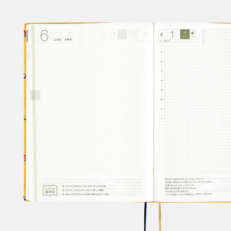 | 記載される内容 | 日番号/週番号(月間カレンダー・週間ダイアリーに記載)/月の満ち欠け(1日ページ全ページに記載、月間カレンダー・週間ダイアリーに満月と新月のみ記載) |