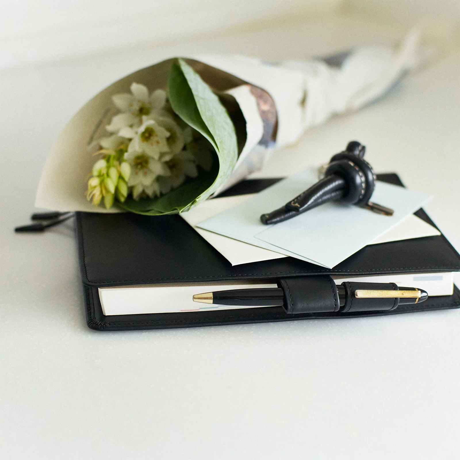 カバーの使いはじめは、ペンホルダー、またはバタフライストッパーの生地や革がかたいため、ペンが抜きさししづらくなっています。