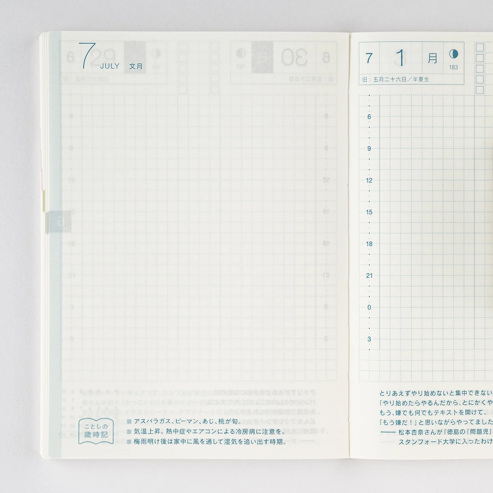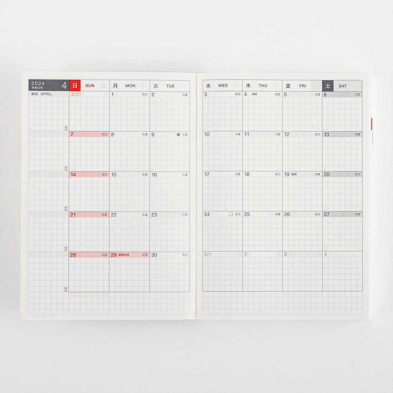 | 記載される内容 | 日番号/週番号(月間カレンダーに記載)/旧暦/六曜(大安、仏滅など)(月間カレンダーに記載)/二十四節気(立春、春分、夏至など)、雑節/祝日、記念日など(バレンタインデー、ひなまつり、母の日、父の日など)/月の満ち欠け(1日ページ全ページに記載、月間カレンダーに満月と新月のみ記載) |