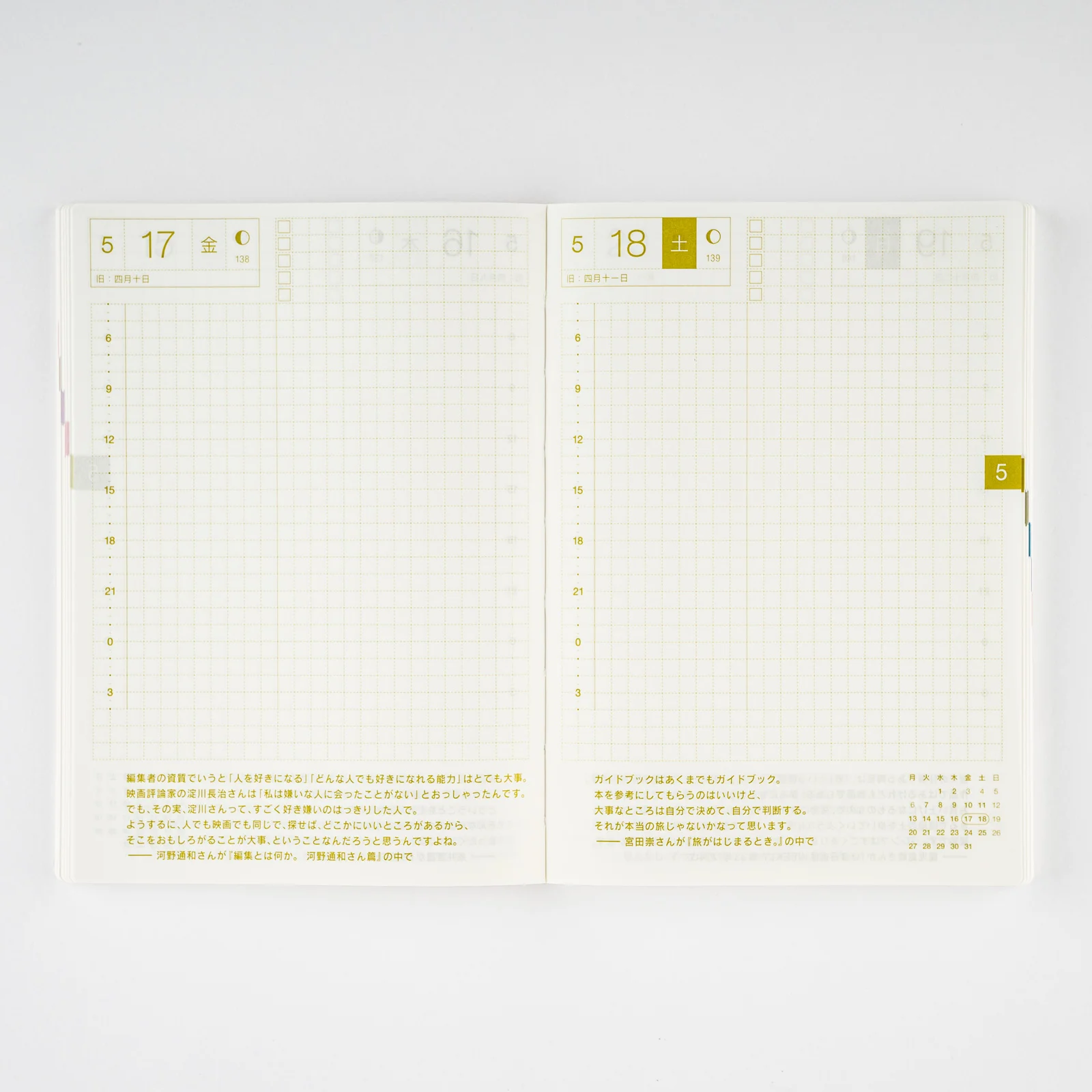 | 紙質・製本 | 薄くて軽く、裏抜けの少ないトモエリバーS(手帳専用紙)/糸かがり製本 |