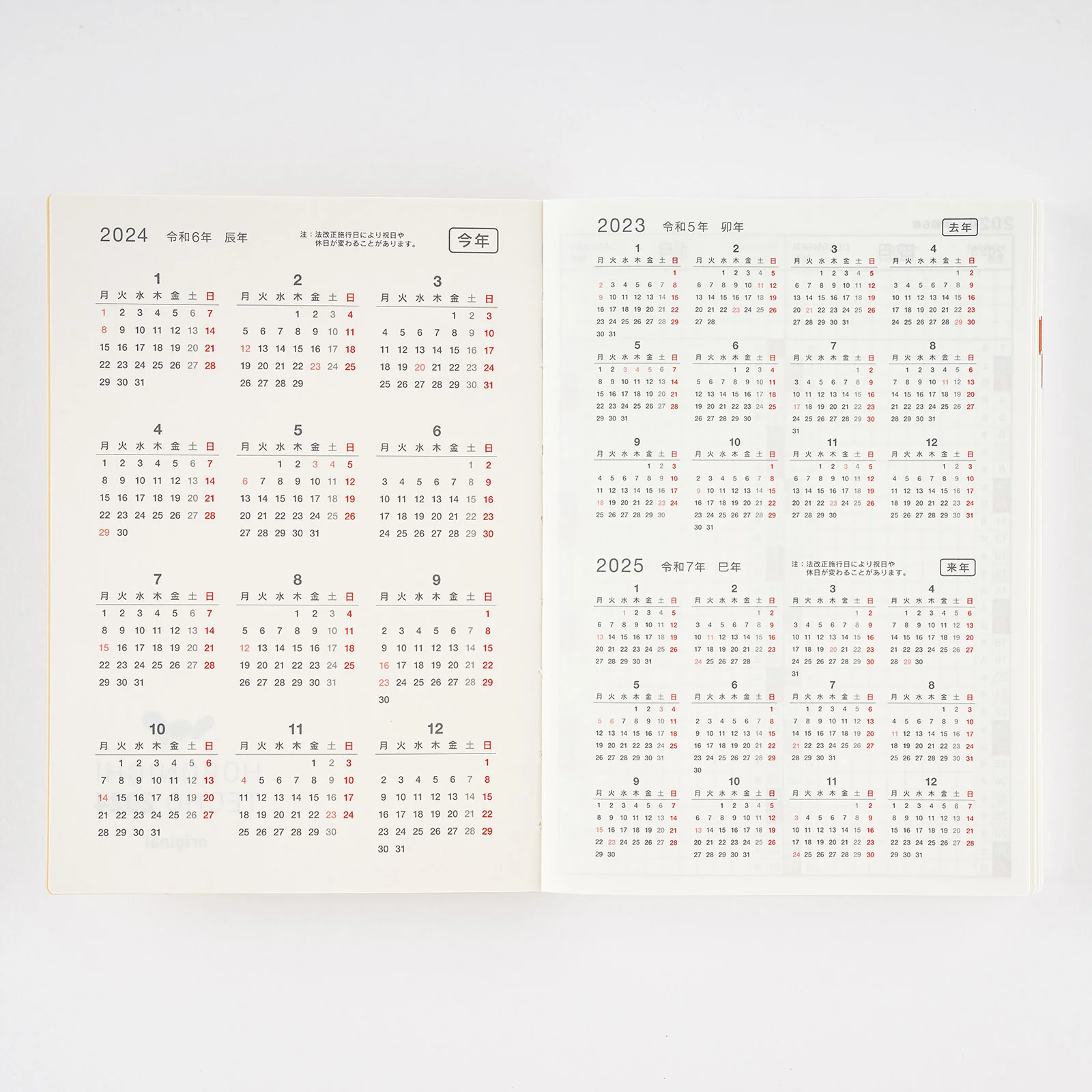 | 1日ページ | 2024年4月1日〜2025年3月31日(全377ページ) *手帳の使いはじめに、自由に使えるウォーミングアップ用ページ(2ページ)があります。 *各月のはじめに、「ことしの歳時記」と、その月のことをまとめて書ける扉ページ(1ページ)があります。 *すべてのページに「日々の言葉」を掲載。 *右ページに「ミニカレンダー」を掲載(月曜もしくは日曜はじまり)。 |