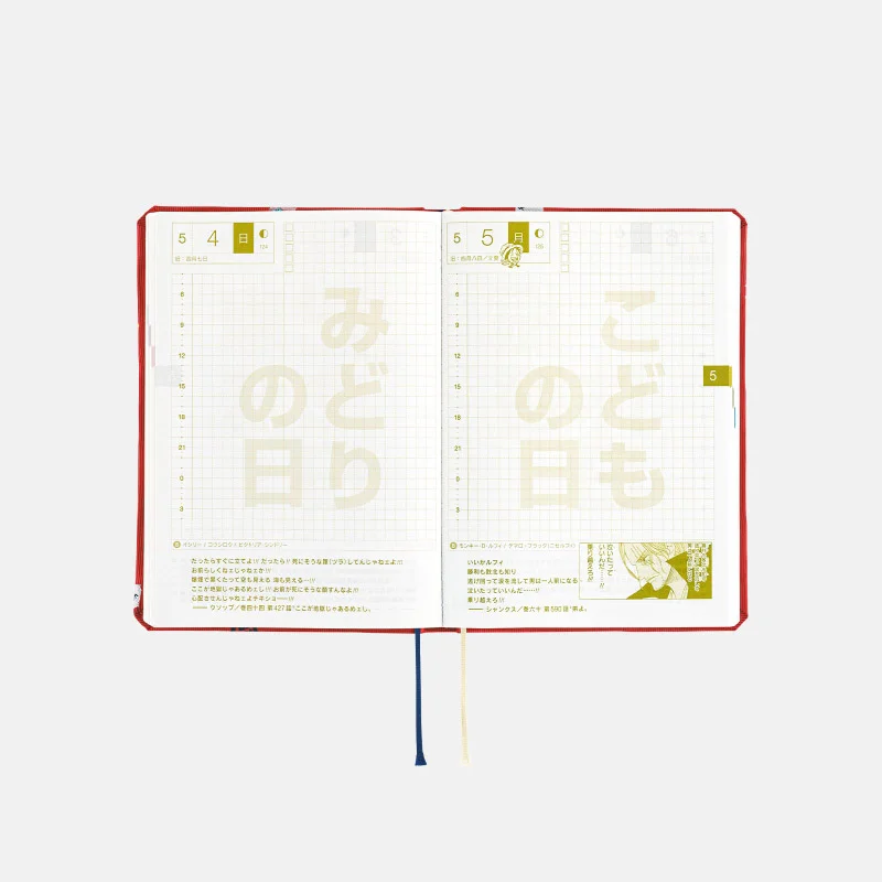 | 1日ページ | 2025年1月1日〜12月31日(全377ページ) *手帳の使いはじめに、自由に使えるウォーミングアップ用ページ(2ページ)があります。 *各月のはじめに、その月のことをまとめて書ける扉ページ(1ページ)があります。 *すべてのページに「日々の言葉」を掲載。 *すべてのページに、その日が誕生日のキャラクター名を記載(107巻時点) |