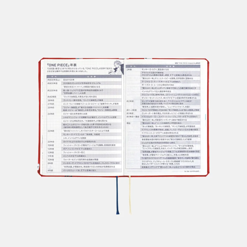 | おまけページ | 『ONE PIECE』年表/ここぞのときに使いたい『ONE PIECE』の言葉/何度でも見たい、読者が選んだ名シーン10選/WANTED/Timetable/Favorites/My 100/二十四節気のこと/もしものときの、準備をしよう/Gifts/満年齢早見表/Addresses (for 6 people)/Personal Notes |