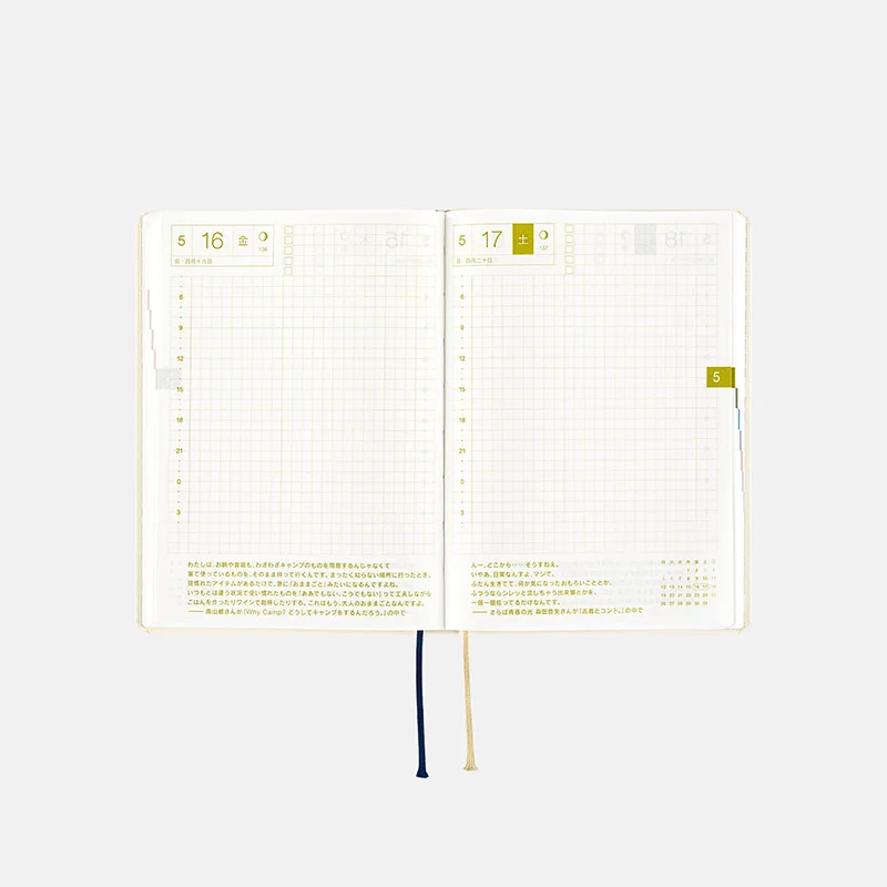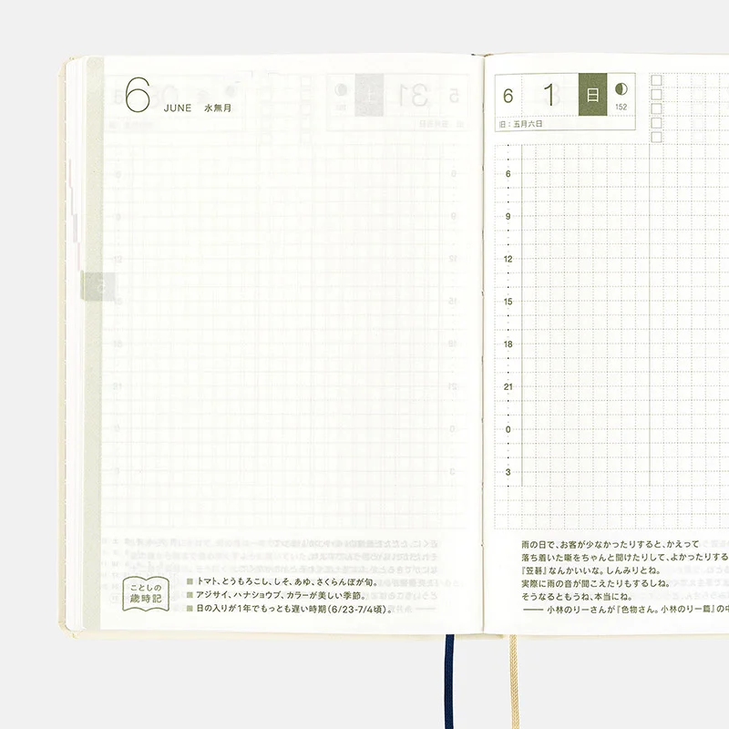 | 記載される内容 | 日番号/週番号(月間カレンダーに記載)/月の満ち欠け(1日ページ全ページに記載、月間カレンダーに満月と新月のみ記載) |