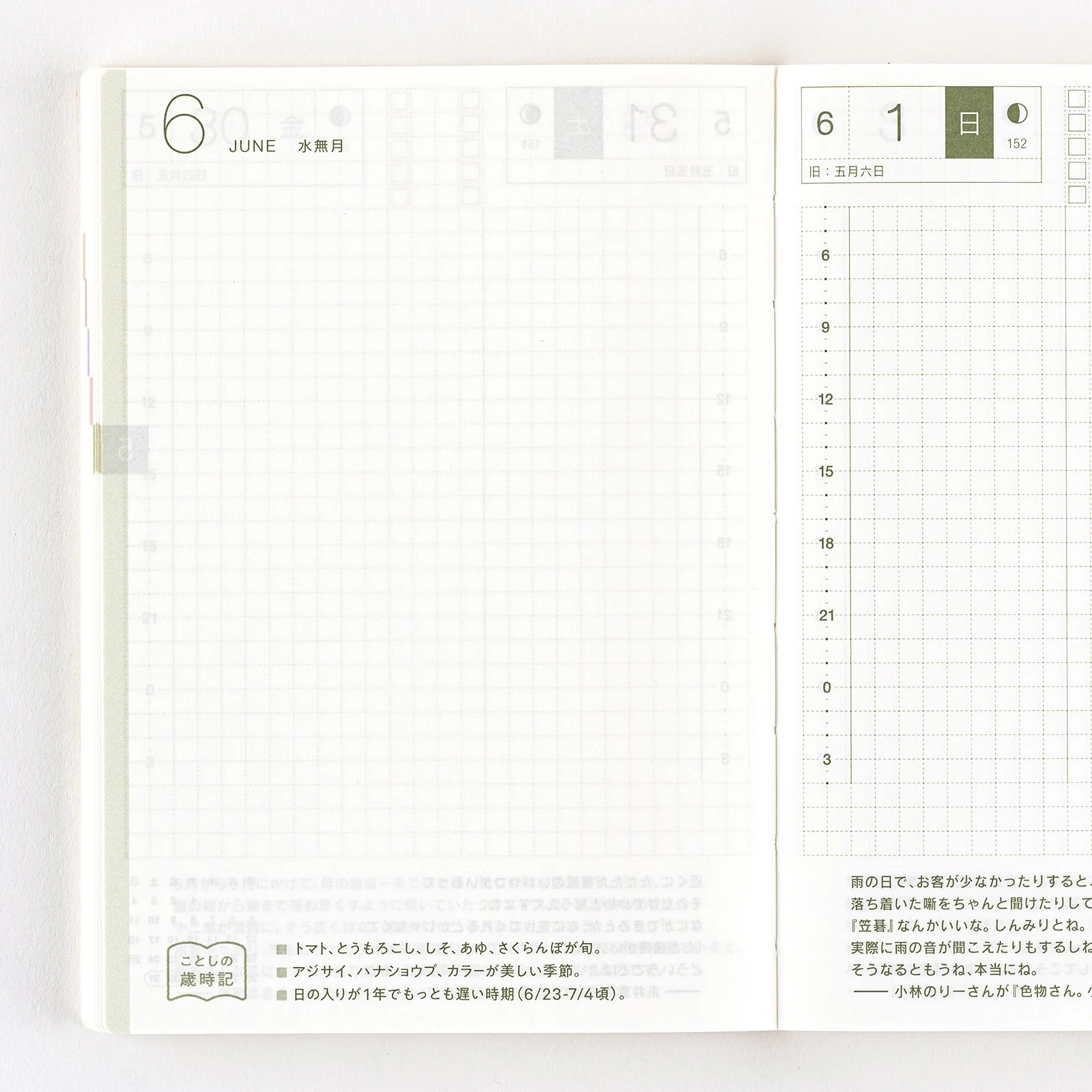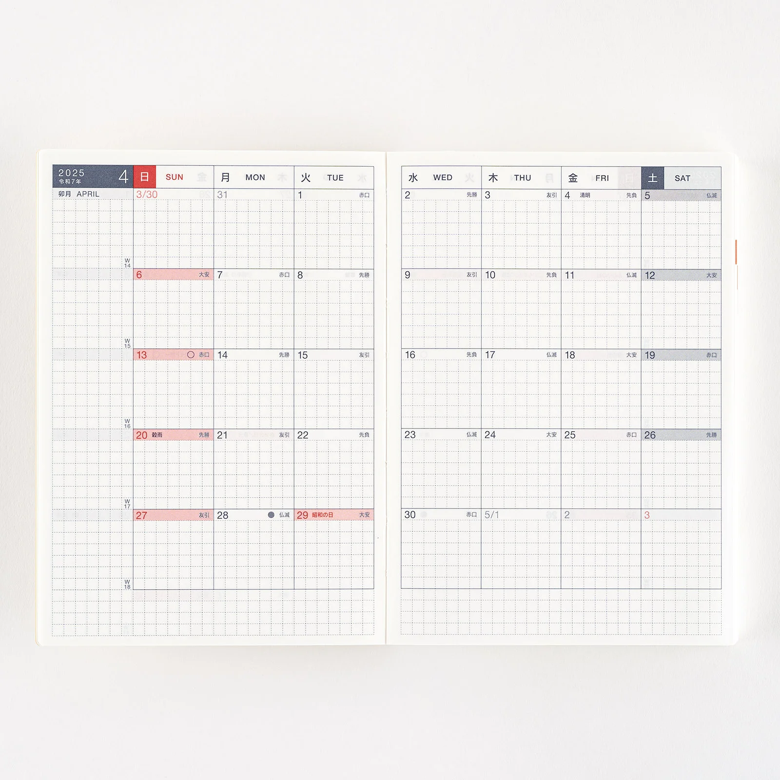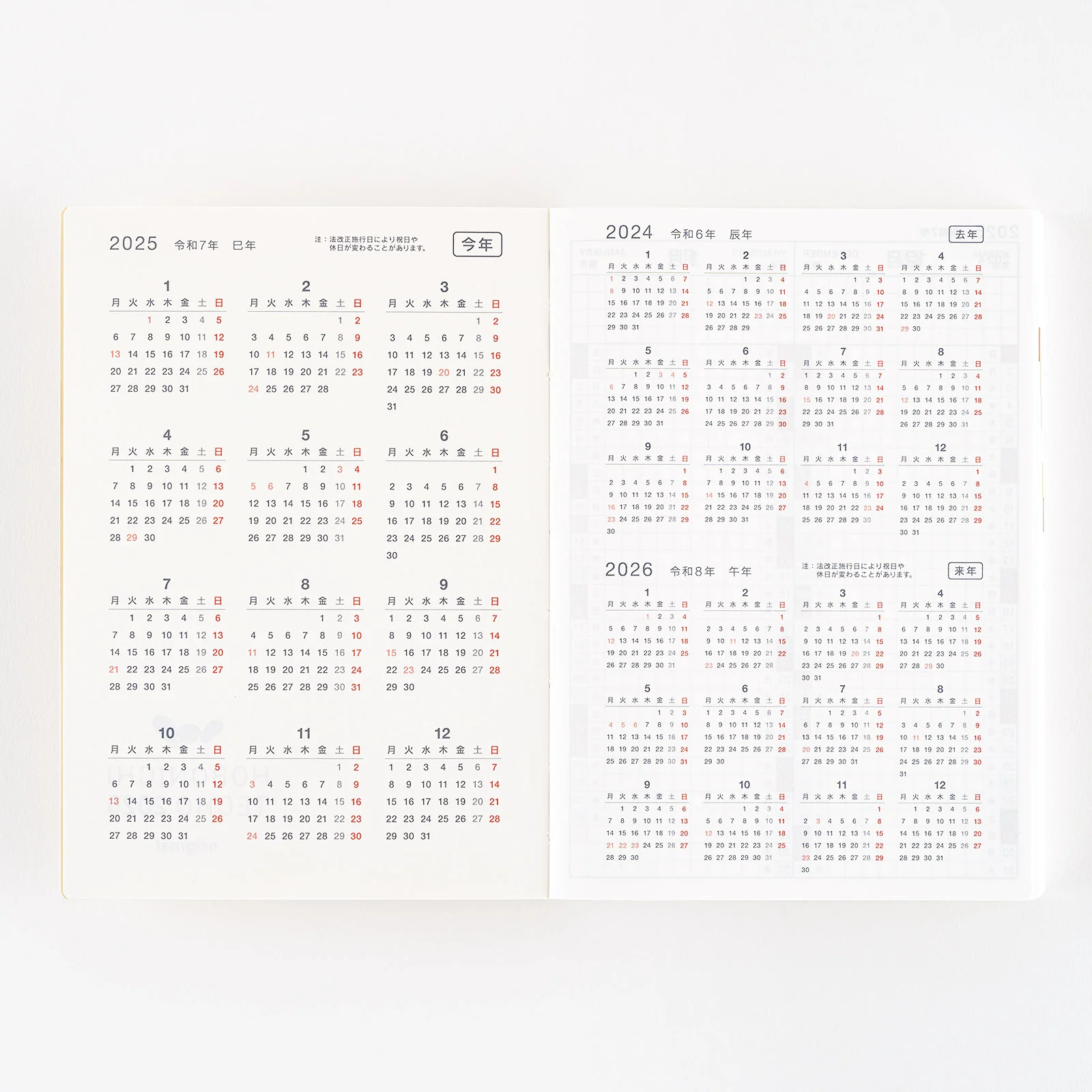 | 1日ページ | 2025年1月1日〜12月31日(全377ページ) *手帳の使いはじめに、自由に使えるウォーミングアップ用ページ(2ページ)があります。 *各月のはじめに、「ことしの歳時記」と、その月のことをまとめて書ける扉ページ(1ページ)があります。 *すべてのページに「日々の言葉」を掲載。 *右ページに「ミニカレンダー」を掲載(月曜もしくは日曜はじまり)。 |