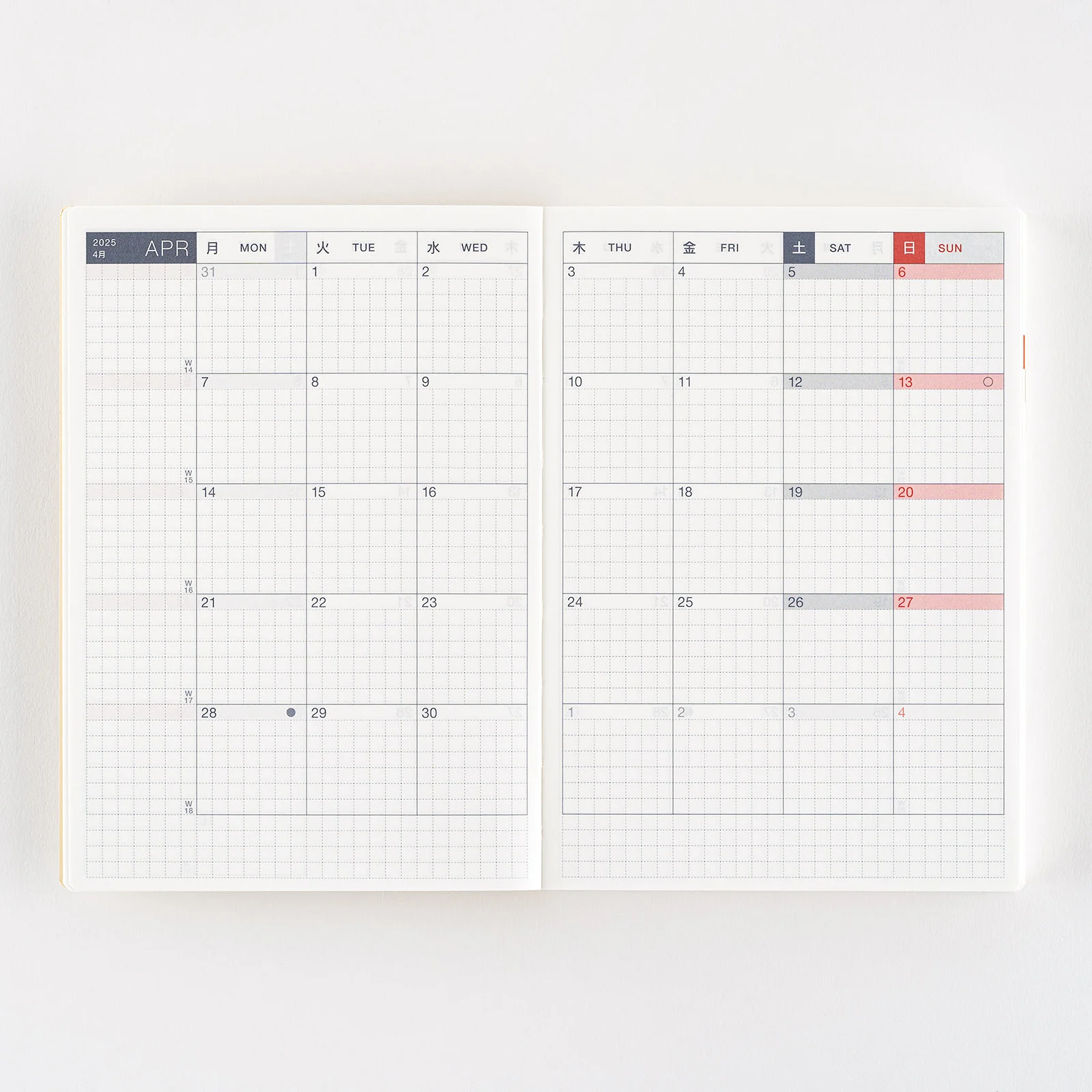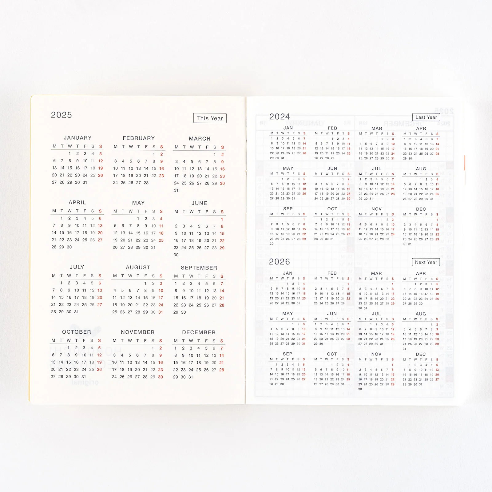 | 1日ページ | 2025年1月1日〜12月31日(全377ページ) *手帳の使いはじめに、自由に使えるウォーミングアップ用ページ(2ページ)があります。 *各月のはじめに、その月のことをまとめて書ける扉ページ(1ページ)があります。 *すべてのページに「日々の言葉」を掲載(見開きに1つ)。 *右ページに「ミニカレンダー」を掲載(月曜はじまり)。 |