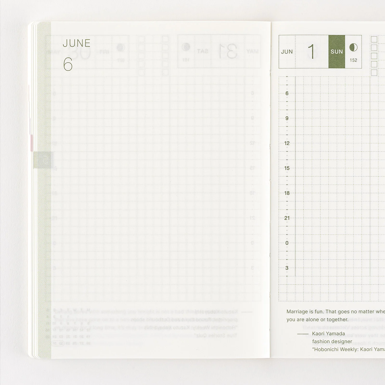 | 記載される内容 | 日番号/週番号(月間カレンダーに記載)/月の満ち欠け(1日ページ全ページに記載、月間カレンダーに満月と新月のみ記載) |