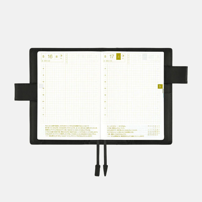 | 記載される内容 | 日番号/週番号(月間カレンダーに記載)/月の満ち欠け(1日ページ全ページに記載、月間カレンダーに満月と新月のみ記載) |