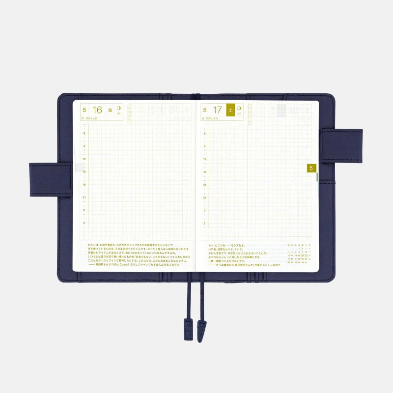 | 記載される内容 | 日番号/週番号(月間カレンダーに記載)/月の満ち欠け(1日ページ全ページに記載、月間カレンダーに満月と新月のみ記載) |