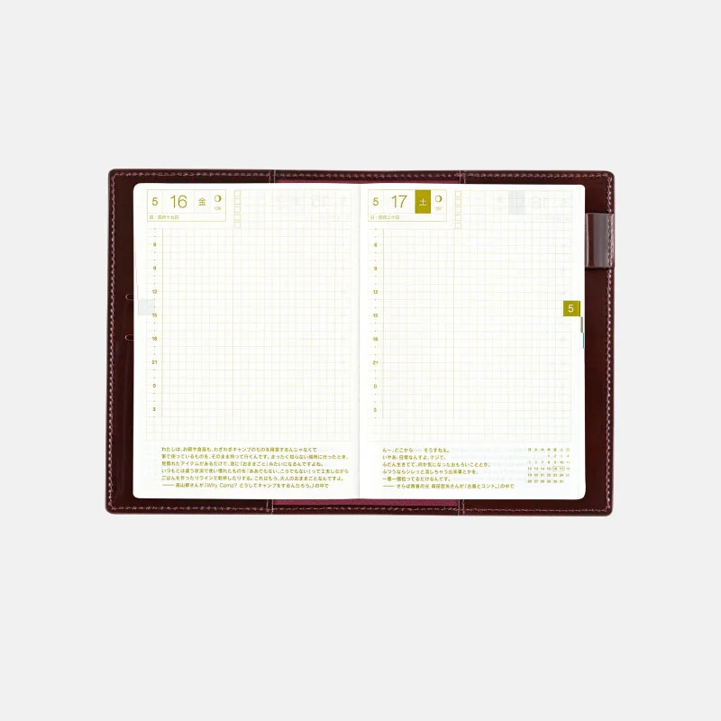 | 記載される内容 | 日番号/週番号(月間カレンダーに記載)/月の満ち欠け(1日ページ全ページに記載、月間カレンダーに満月と新月のみ記載) |