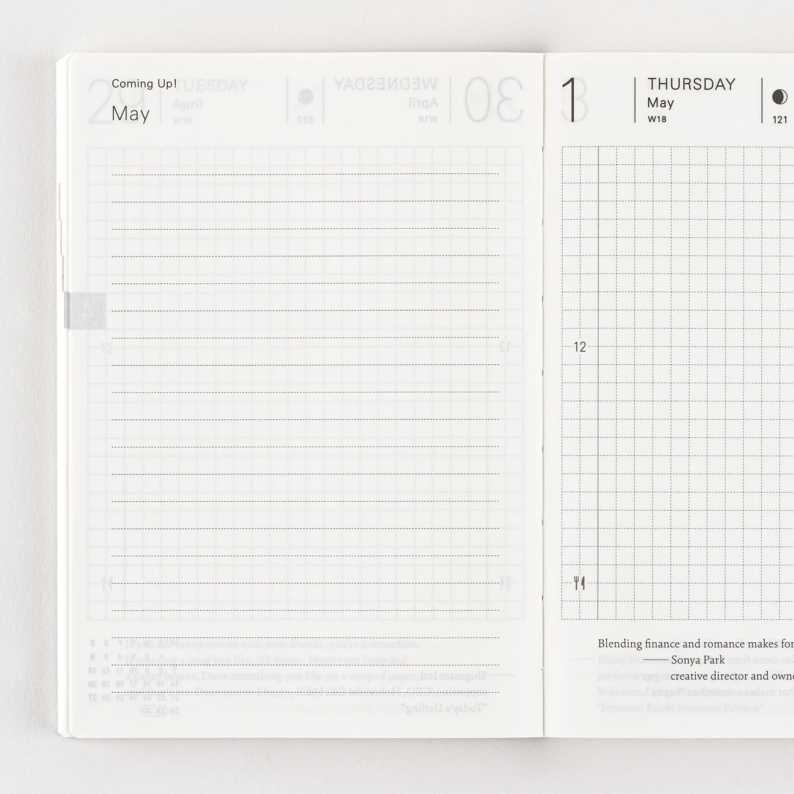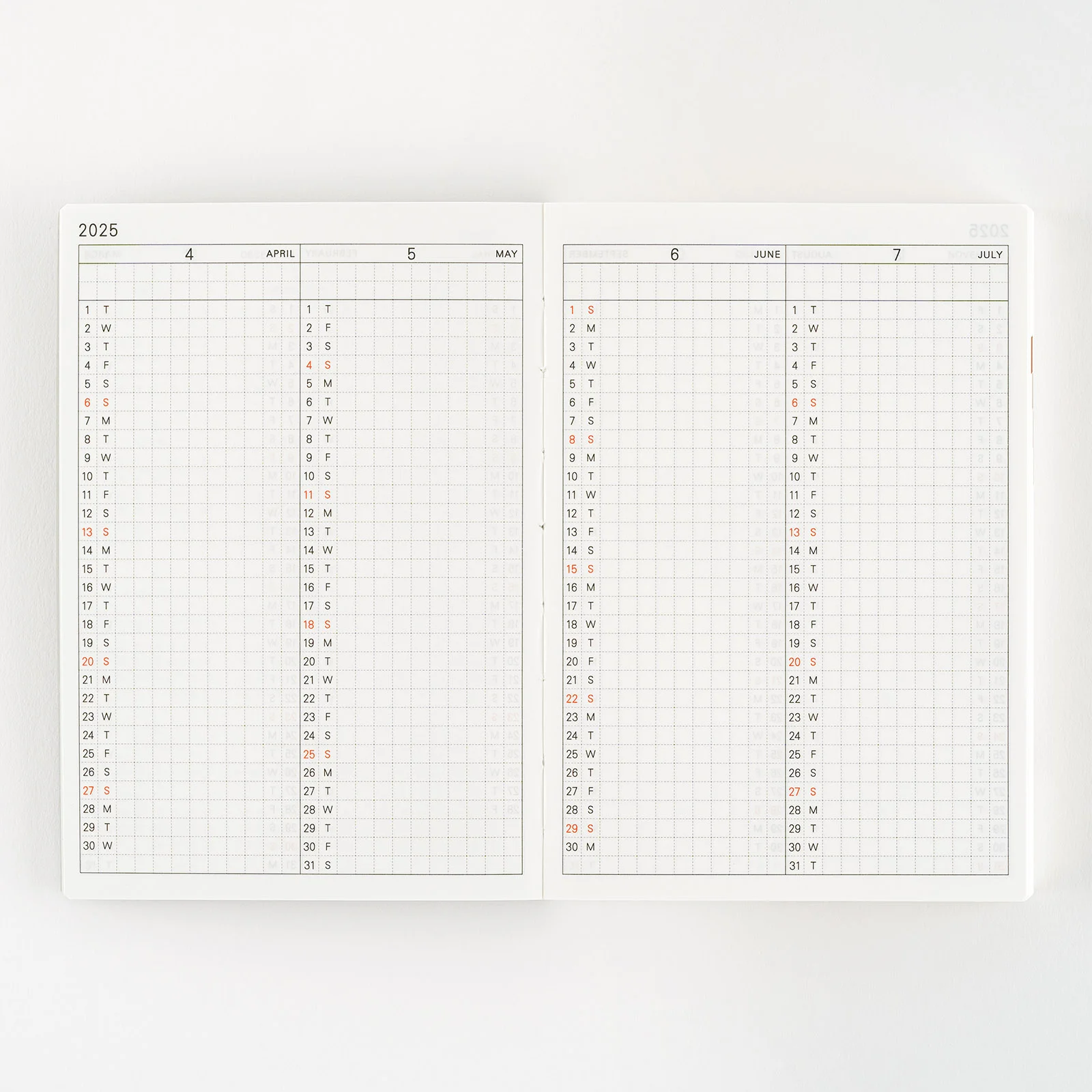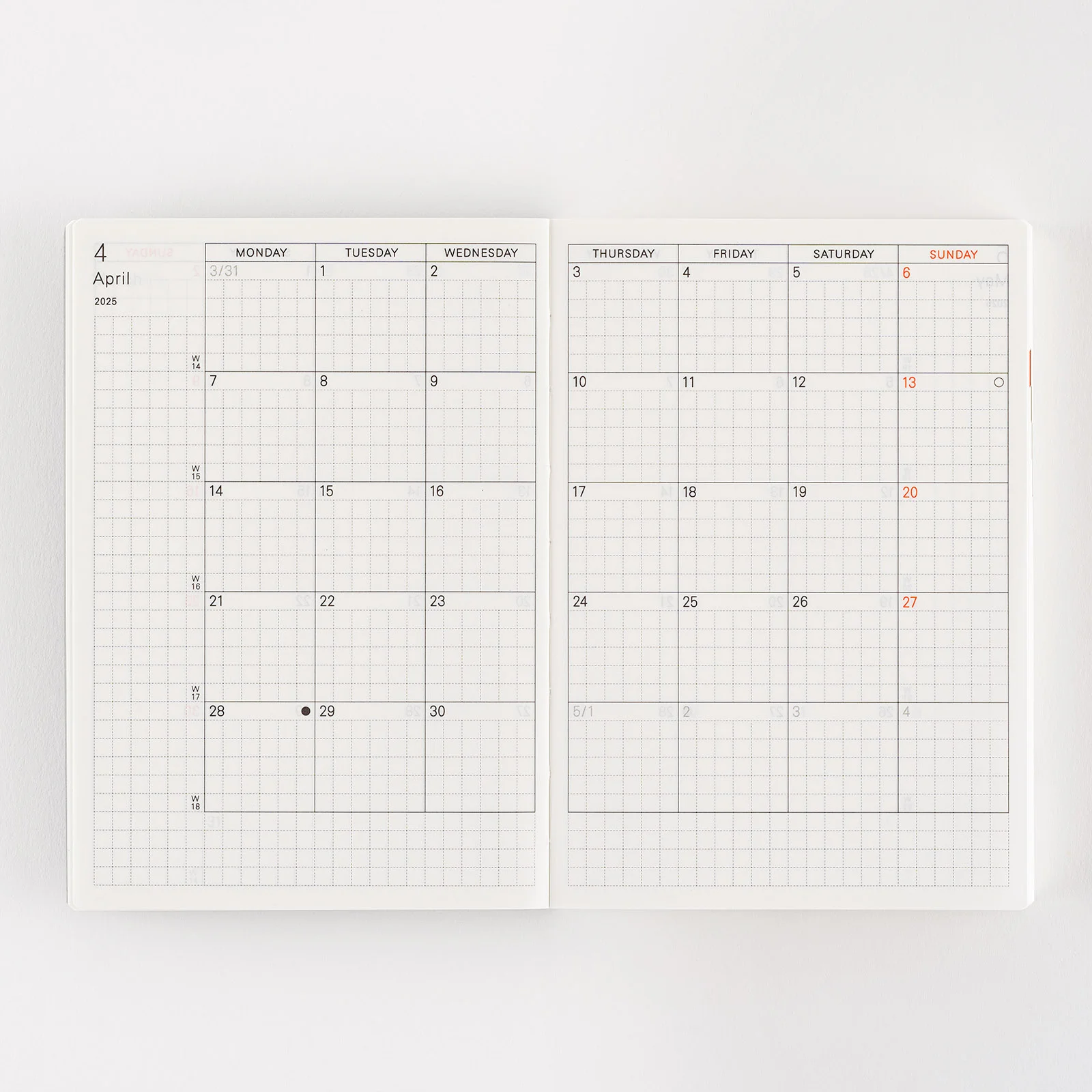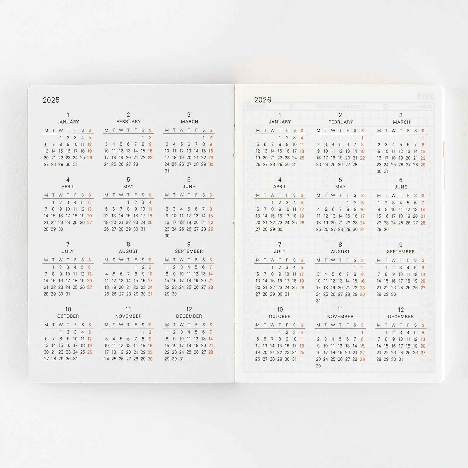 | 1日ページ | 2025年1月1日〜12月31日(全377ページ) *手帳の使いはじめに、自由に使えるウォーミングアップ用ページ(2ページ)があります。 *各月のはじめに、その月のことをまとめて書ける扉ページ(1ページ)があります。 *すべてのページに「日々の言葉」を掲載(見開きに1つ)。 *右ページに「ミニカレンダー」を掲載(月曜はじまり)。 |