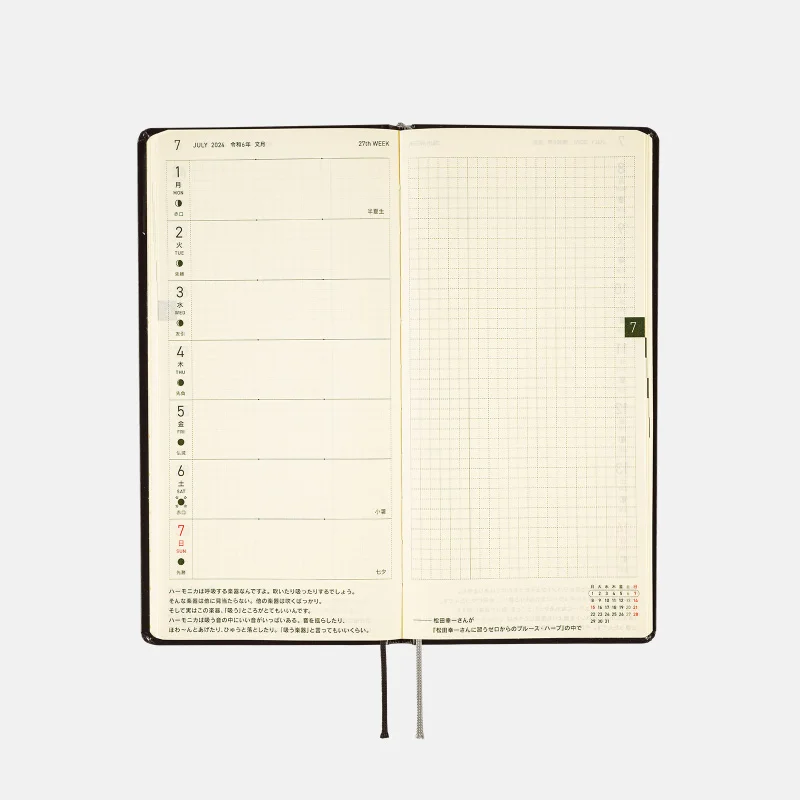 | 記載される内容 | 週番号/六曜(大安、仏滅など)/二十四節気(立春、春分、夏至など)/祝日、記念日など(バレンタインデー、ひなまつり、母の日、父の日など)/月の満ち欠け(週間ページ全てに記載・月間カレンダーに満月と新月のみ記載) |