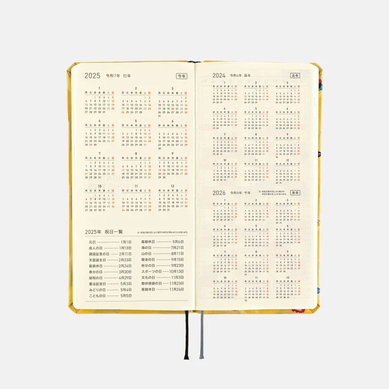 | 記載される内容 | 週番号/六曜(大安、仏滅など)/二十四節気(立春、春分、夏至など)/祝日、記念日など(バレンタインデー、ひなまつり、母の日、父の日など)/月の満ち欠け(週間ページ全てに記載・月間カレンダーに満月と新月のみ記載) |