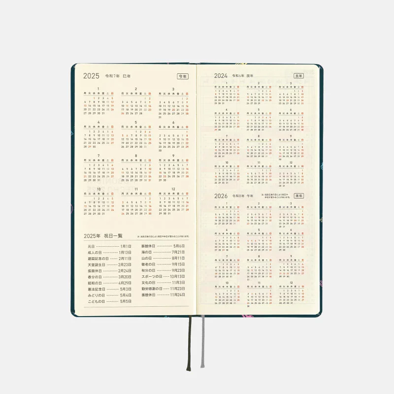 | 記載される内容 | 週番号/六曜(大安、仏滅など)/二十四節気(立春、春分、夏至など)/祝日、記念日など(バレンタインデー、ひなまつり、母の日、父の日など)/月の満ち欠け(週間ページ全てに記載・月間カレンダーに満月と新月のみ記載) |