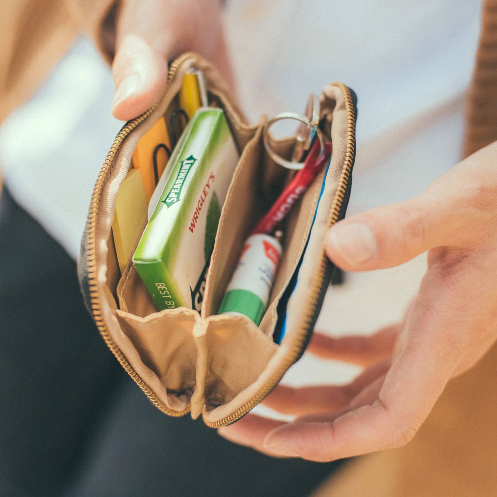 カードにお金、カギや薬類といった、必要最低限のものだけを持ち歩くポーチとして。出張中のホテル内でも、このポーチひとつがあれば安心です。